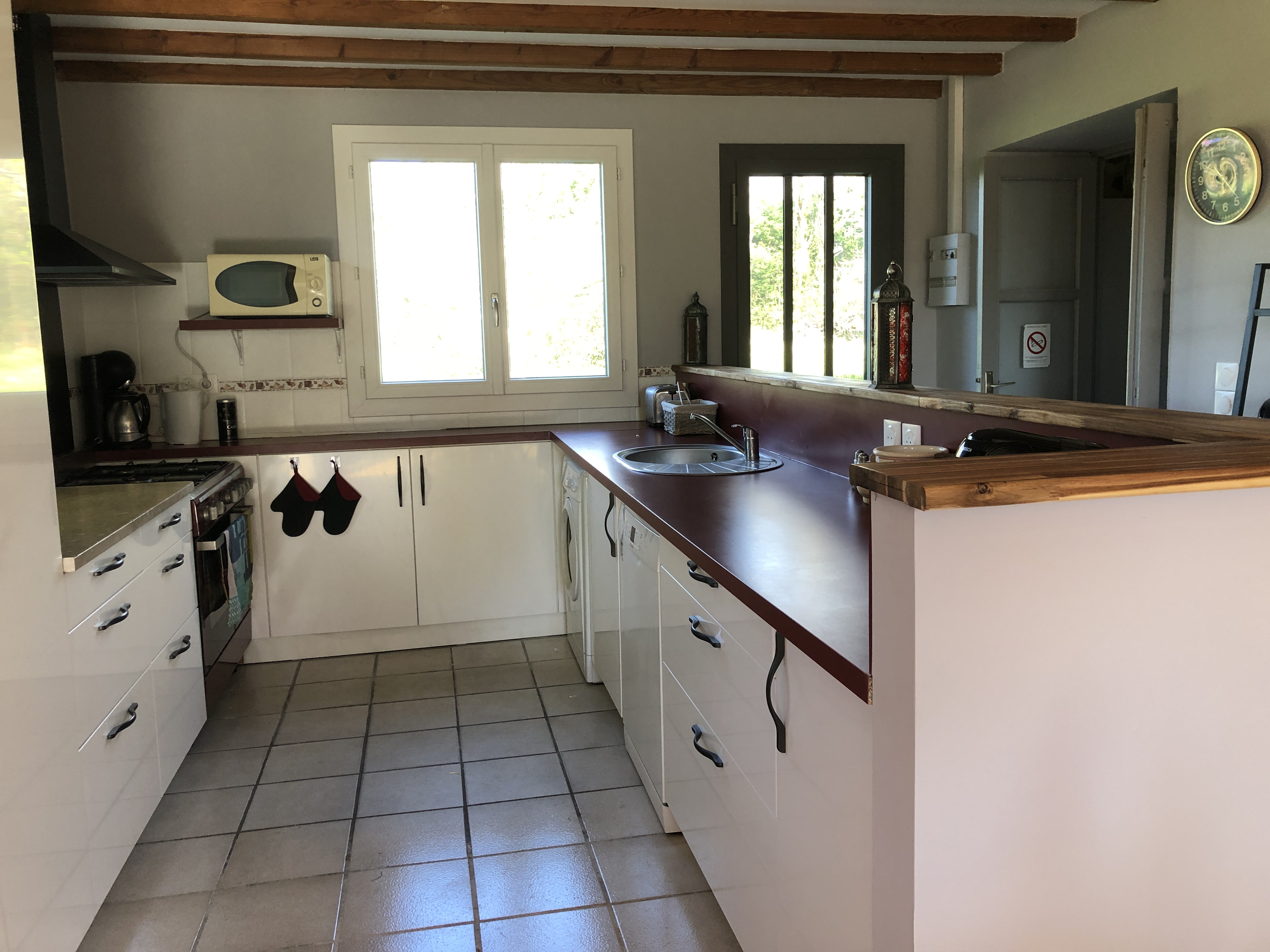 Cuisine : micro onde, lave vaisselle, lave linge, réfrigérateur congélateur.